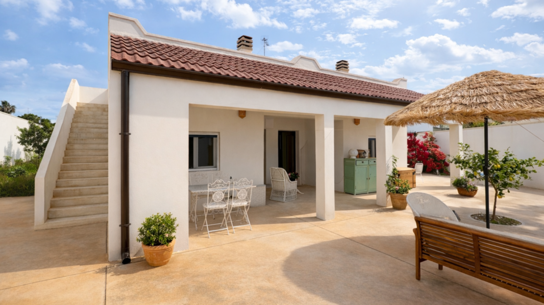 A splendid renovated property of approximately 110 sqm located just a few meters from the enchanting beaches of the Salento Adriatic coast, particularly interesting for both residential use and as an investment. The location is one of its absolute strengths: the immediate proximity to the sea makes it an ideal solution for those wishing to live or vacation in a quiet yet highly strategic setting. The property consists of two adjacent residential units, each equipped with two bedrooms, a kitchen, and a bathroom—a configuration that also lends itself perfectly to hospitality use, allowing for excellent profitability through the possibility of renting the two dwellings separately. Access is via a charming wooden door leading to a fenced outdoor space, partly paved and partly used as a garden of approximately 350 sqm, offering an atmosphere of relaxation and privacy. Further value is provided by the roof terrace, accessible via an external staircase. Externally, there is a covered veranda of about 30 sqm, partly tiled, ideal for enjoying the outdoor spaces even in the shoulder seasons. The small garden features a stone fireplace for barbecues and a convenient outdoor sink, elements that further enhance the livability of the area. The interior spaces are climate-controlled via heat pumps, ensuring comfort in both summer and winter, while high-quality PVC window frames ensure excellent thermal and acoustic insulation. The property is completed by a pleasant gazebo with a reed covering, perfect for outdoor dining, and an overall context that perfectly combines functionality, construction quality, and an enviable location.